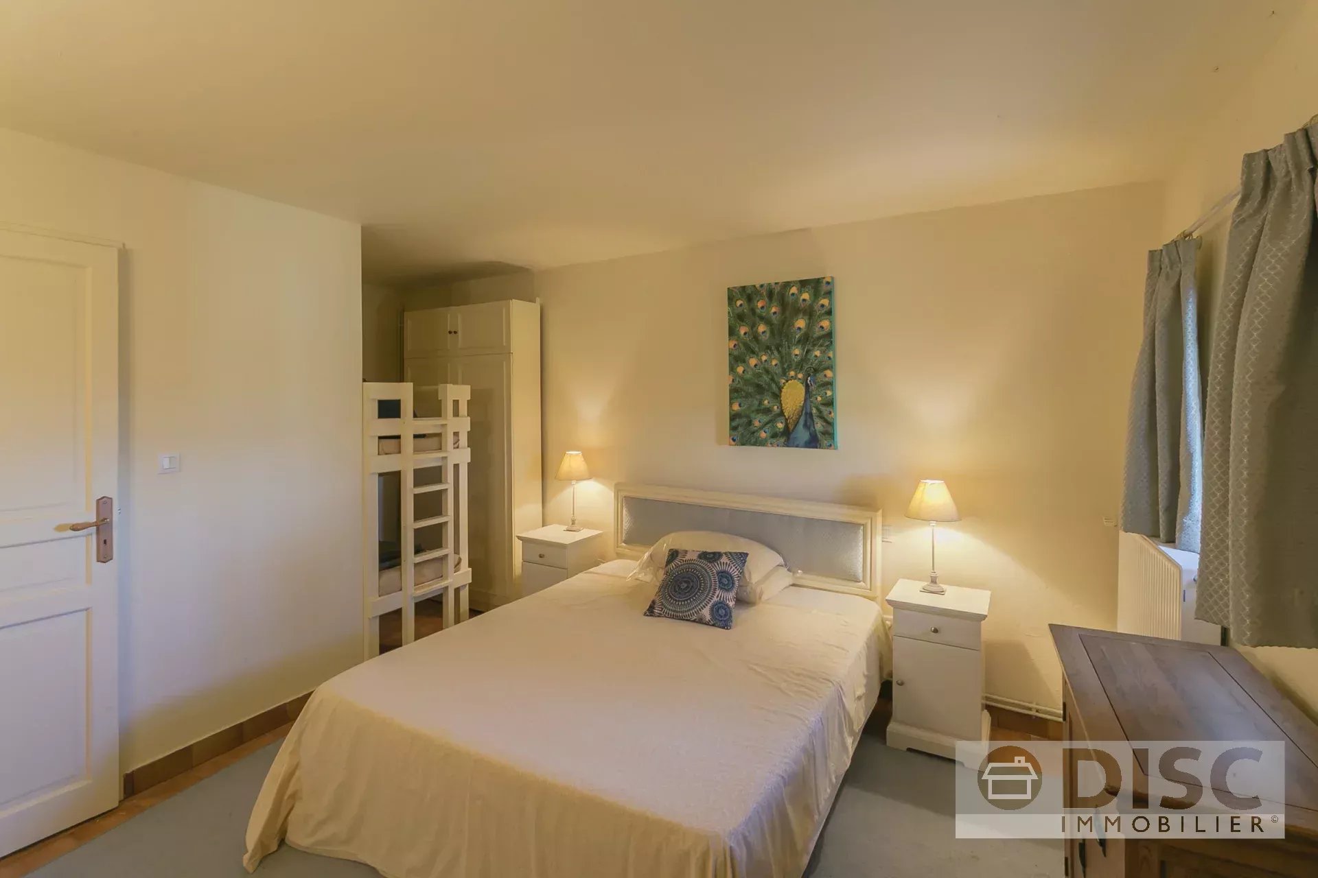 Au rez-de-chaussée se trouve également une chambre, elle aussi dotée d’un accès extérieur, ainsi qu’une salle d’eau avec douche, WC et double vasque.