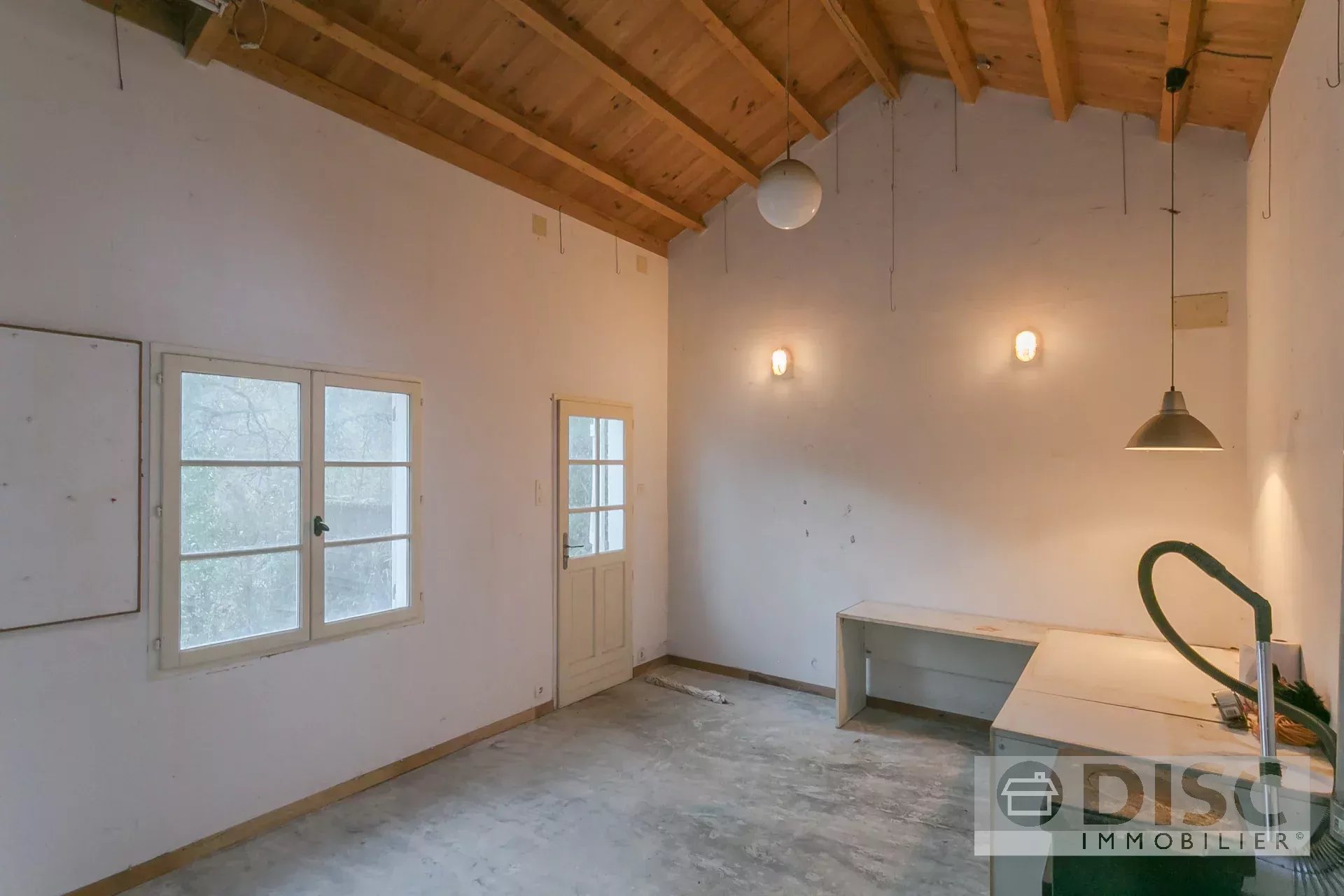 Un couloir dessert ensuite une chambre de 11 m², puis une salle de bain de 5 m² comprenant douche, baignoire, lavabo et WC. Enfin, une grande pièce de 17 m², ancien atelier, complète l’ensemble. Cette dernière dispose d’un beau volume grâce à son plafond haut, d’un velux et d’une porte donnant sur l’extérieur.